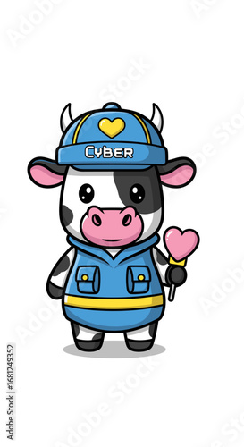 Cow holds heart lollipop wearing cyber hat. Cute cartoon, mascot, kawaii, whimsical, cyber security, digital, technology, love, happy, fun, adorable