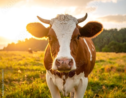 Cow in golden meadow at sunset