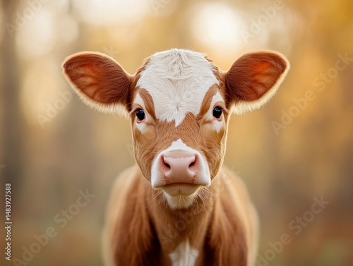 Cow looking directly into the camera, curious and expressive, soft bokeh background