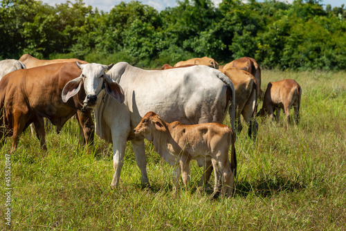 Cow with calf standing on grazing , One young standing brown cow and a white cow together.