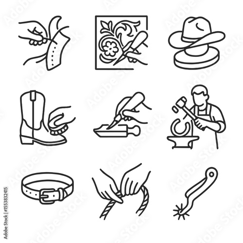Cowboy Craftsmanship Icons. Outline style icons of Cowboy Craftsmanship: saddle stitching, leather carving, hat shaping, boot
