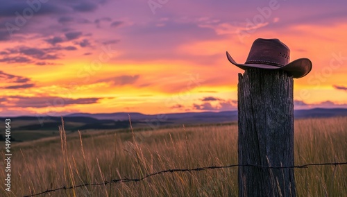 Cowboy Hat Silhouette at Sunset: Vibrant Horizon Over Rural Fields and Wooden Fence