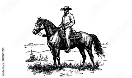 Cowboy on Horseback Ink Sketch Vector Illustration Engraving Style Minimalist Design