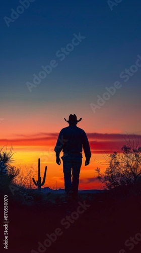 Cowboy silhouette at sunset in desert landscape, dramatic sky. Western lifestyle and adventure concept