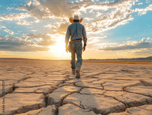 Cowboy walking across dry cracked earth at sunset in open landscape