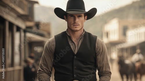 Cowboy walking through a dusty western town during golden hour in the late afternoon sun