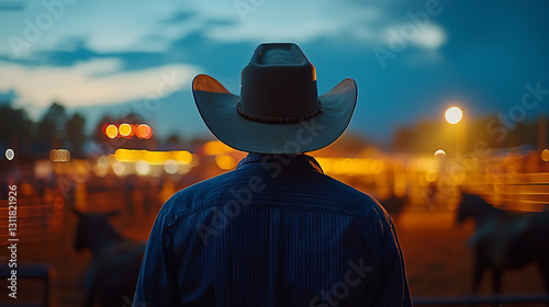 Cowboy watches the sunset at a lively ranch during a regional rodeo event filled with excitement and community connection
