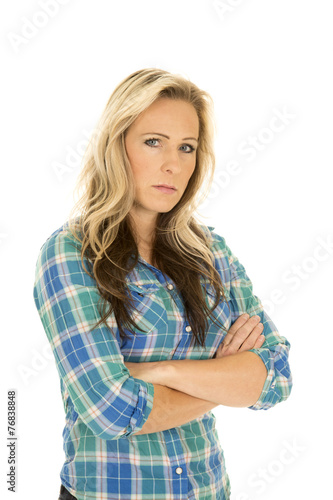cowgirl blue shirt arms folded serious