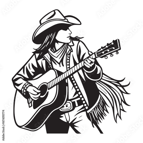 Cowgirl playing guitar isolated on white background in black and white drawing