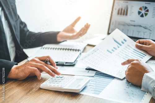 Co-working Business Team meeting Planning Strategy Analysis investment and saving concept. meeting discussing new plan financial graph data.