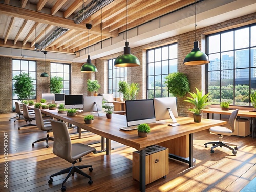 Coworking Space Interior: Wooden Desks, PCs, Windows - Stock Photo