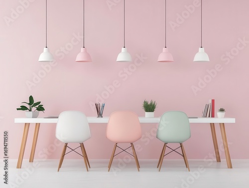 Coworking space with minimalist modular desks and pastel accents