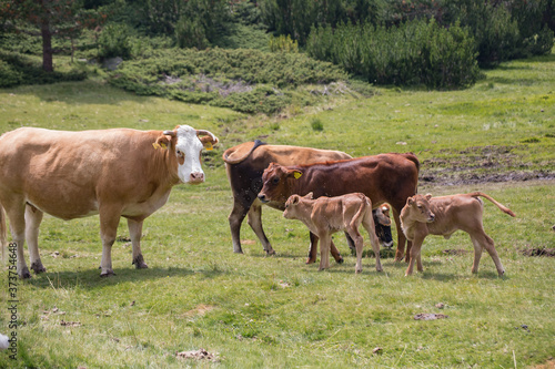 Cows eating grass on mountain pasturage in Pirin National Park, Bulgaria