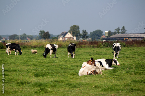 Cows graze in a field. Green grass background with copy space. Domestic animal photo. Dutch countryside landscape.
