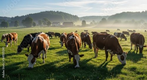 Cows graze in a misty, green meadow under a soft, sunny sky