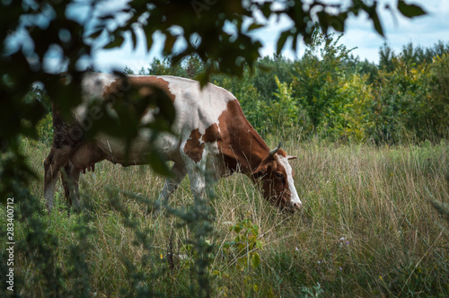 cows graze in the summer on the field on a sunny day and eat green grass alfalfa clover