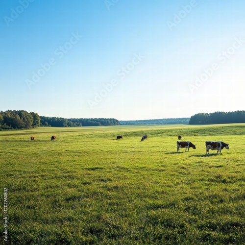 Cows graze peacefully in a lush green meadow under a clear blue sky during a bright afternoon. Generative AI
