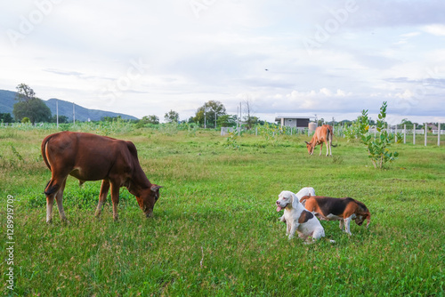 Cows Grazing in a Green Field with Beagle Dogs Resting Nearby Outdoors