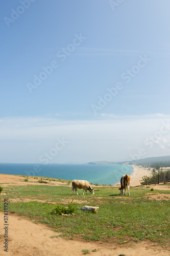 Cows on a hill against the background of the Baikal beach
