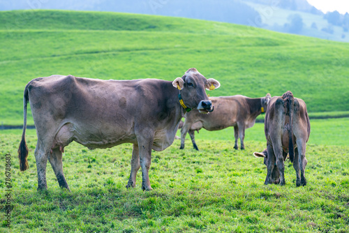 Cows on a pasture in Alps. Cows eating grass. Cows in grassy field. Dairy cows in the farm pastures. Brown cow pasturing on grassy meadow near mountain. Cow in pasture on alpine meadow in Switzerland.