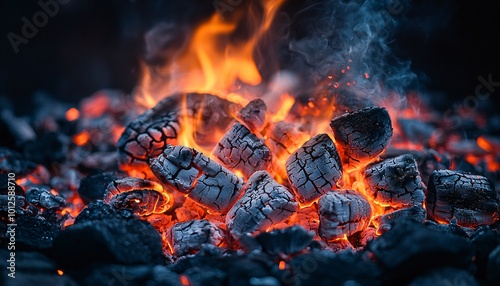 Cozy Ambiance: Intimate View of Swirling Fire in Metal Fireplace, Embers Glowing, Smoke Drifting, Warmth and Comfort Concept, Medium Shot