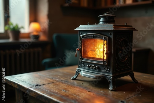 Cozy ambiance of a rustic interior featuring a decorative fireplace with warm glowing embers on a wooden table
