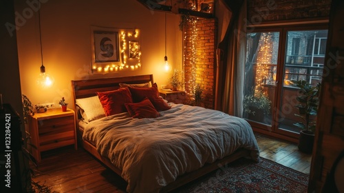 Cozy and Inviting Bedroom with Warm Lights and Natural Decor