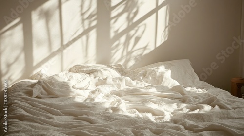 Cozy and Inviting Blankets on an Unmade Bed with Gentle Morning Light Streaming Through the Windows Creating Beautiful Shadow Patterns