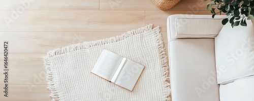 Cozy and inviting reading nook with stack of books and plush blanket on wooden floor in warm minimalist and serene home interior design Comfortable and relaxing atmosphere for reading