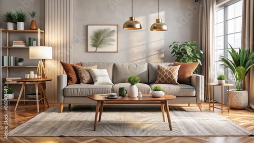 Cozy and modern living room interior with plush sofa, coffee table, and decorative elements, living room, interior design