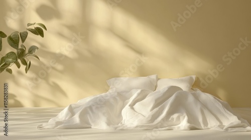 Cozy and Serene Bed with White Linen Against Soft Yellow Wall