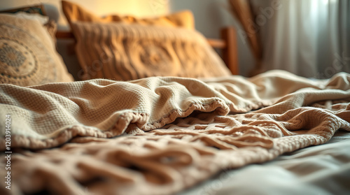 Cozy and Warm Bedroom Interior: Soft Knit Blanket, Comfortable and Relaxing Atmosphere