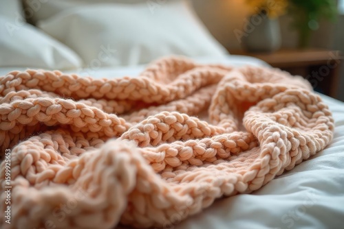 Cozy and warm knitted blanket draped over a bed, perfect for a sleepy afternoon nap Soft textures and inviting colors create a peaceful atmosphere , bedding, fabric
