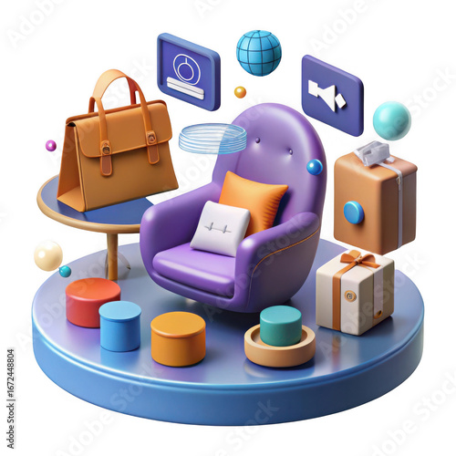 Cozy armchair and shopping bag surrounded by gifts and abstract spheres isolated on transparent background