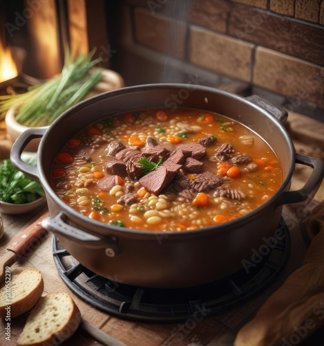 Cozy atmosphere with a large pot of simmering beef and barley soup on the stovetop, warm, kitchen, peaceful
