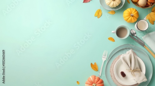 Cozy Autumn Breakfast Table Setting with Pumpkins and Fall Leaves