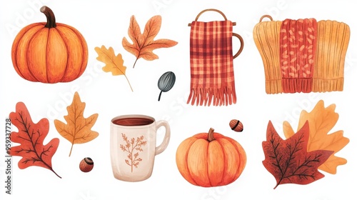 Cozy Autumn Elements in Soft Rounded Style - Leaves, Pumpkins, Acorns, Scarves, Hot Beverages, Blankets