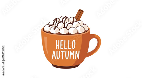 Cozy autumn hot chocolate drink with marshmallows and chocolate drizzle in orange mug saying hello autumn