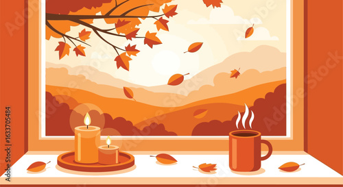Cozy autumn scene with candles and coffee by the window view