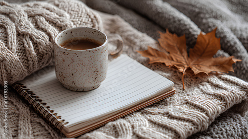 Cozy Autumn Workspace: Blank Notepad Coffee and Knit Sweater Flatlay