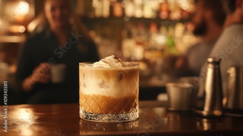 Cozy Bar Scene with Creamy Cocktail on Wooden Counter. Generative ai