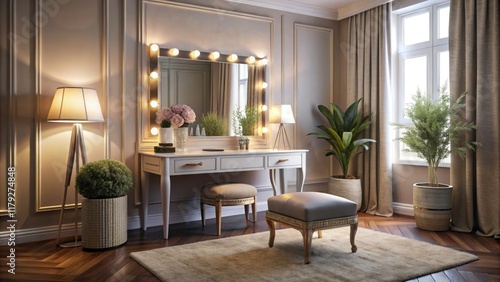 Cozy Bedroom Dressing Table with Charming Mirror and Comfortable Stool for Makeup Application