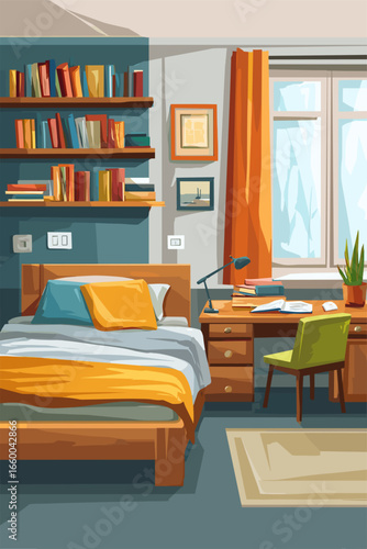 Cozy Bedroom Interior with Bookshelves and Modern Furniture