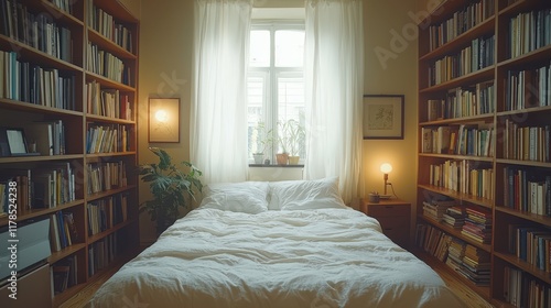 Cozy Bedroom Interior with Bookshelves White Bedding and Natural Light
