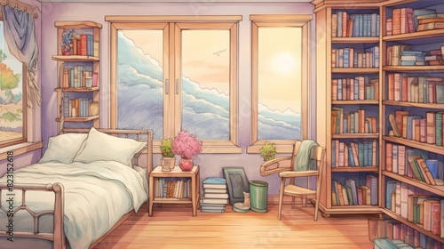 Cozy bedroom interior with large windows offering a scenic view, filled with bookshelves and warm sunlight creating a serene atmosphere.