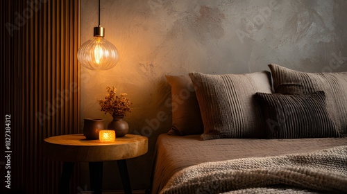 Cozy Bedroom Interior with Warm Lighting and Earthy Tones.