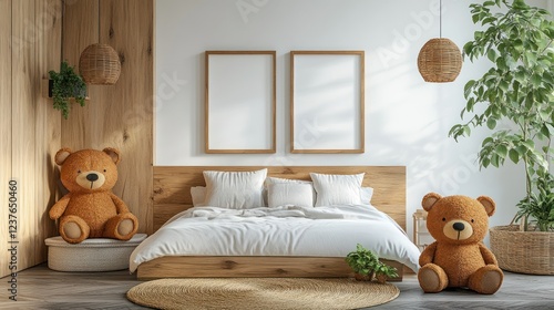 Cozy bedroom, mockup posters, teddy bears, plants, sunlight