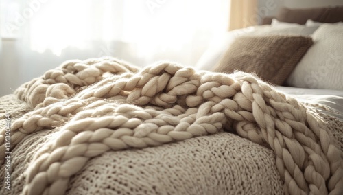 Cozy beige chunky knit blanket on bed, sunny bedroom