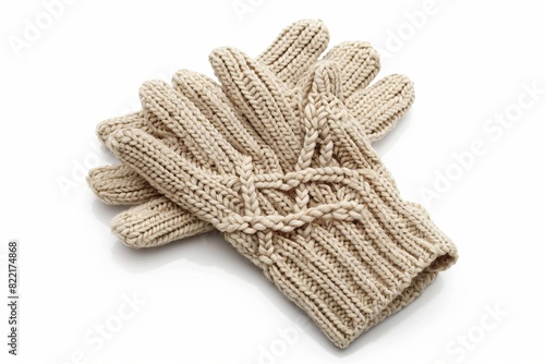 Cozy beige knit gloves with patterns on white background. Warm winter accessory
