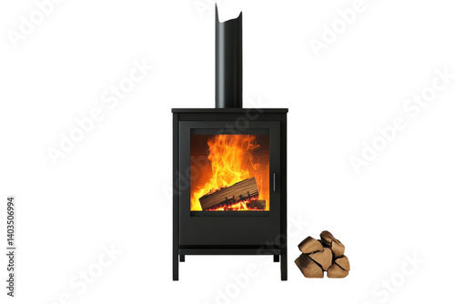 Cozy black wood burning stove with warm inviting fire glowing brightly against a dark background